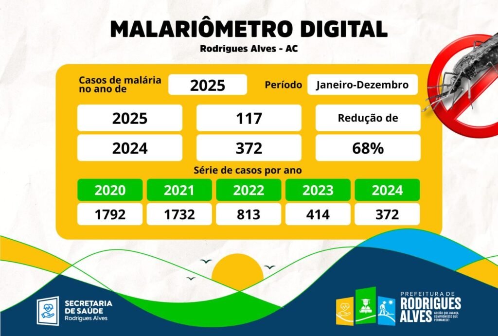 A gestão do prefeito Salatiel Magalhães e do vice-prefeito Neto  do Jamilson  alcançou um marco histórico na área da saúde pública em Rodrigues Alves, no Vale do Juruá. Dados consolidados de 2025 da Coordenação de Vigilância Entomológica apontam uma redução de 68,5% nos casos de malária em comparação com o ano de 2024 — a maior queda já registrada na história do município.