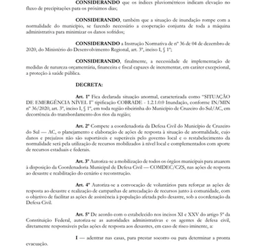 De acordo com o Decreto à Defesa Civil do Município de Cruzeiro do Sul cabe o planejamento e elaboração de ações de resposta à situação de anormalidade, cujo danos e prejuízos não são suportáveis e superáveis pelo governo local. O restabelecimento da normalidade será pela utilização de recursos mobilizados à nível local e complementados com aporte de recursos estaduais e federais.