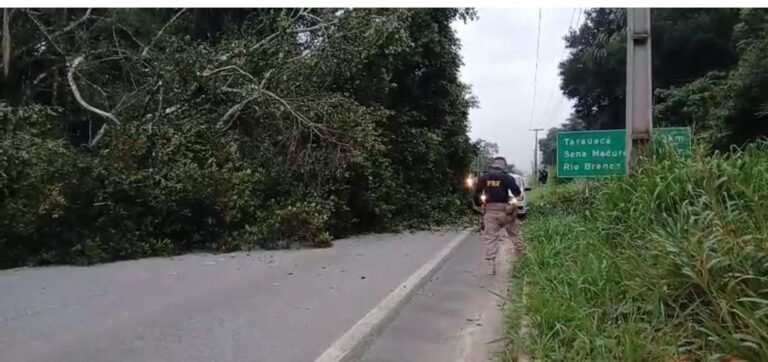 Uma árvore de grande porte caiu e interditou parcialmente uma das pistas da BR-364 na manhã desta quarta-feira. O incidente
