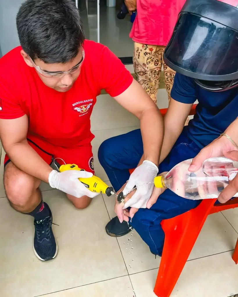 Um homem precisou da ajuda do Corpo de Bombeiros após ficar com um anel preso no dedo, em Cruzeiro do Sul. A ocorrência foi registrada na quinta-feira, 12, e exigiu o uso de equipamento específico para a retirada do objeto.