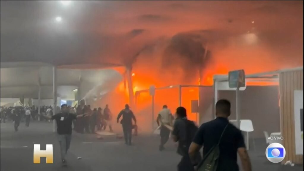 Um incêndio atingiu a Blue Zone da COP30 em Belém, no Pará, na tarde desta quinta-feira (20).