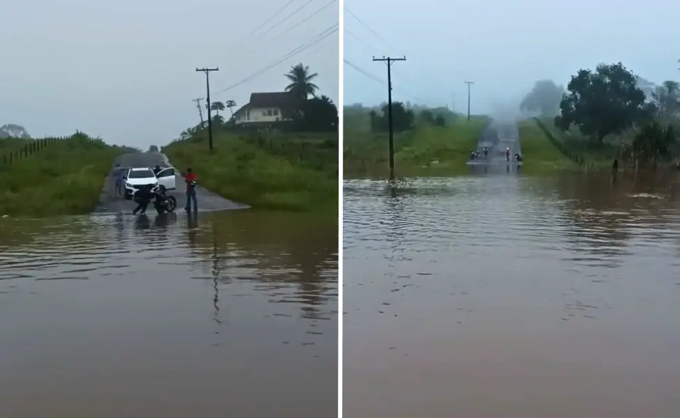 Parte da Rodovia AC-407, que dá acesso ao município de Rodrigues Alves, está interditado na manhã desta quinta-feira, 12, após um açude com barragem transbordar e tomar conta da via.