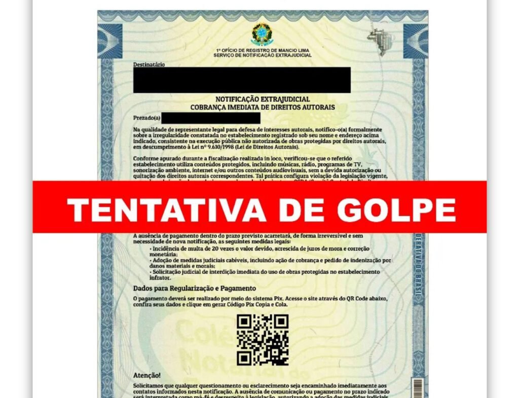 O Cartório da Comarca de Mâncio Lima emitiu um alerta importante à população após identificar uma tentativa de golpe usando o nome da instituição. Segundo o tabelião e oficial de registros, Kadial Cavalcante Martins, criminosos estão falsificando e enviando notificações extrajudiciais alegando supostas cobranças de direitos autorais.
