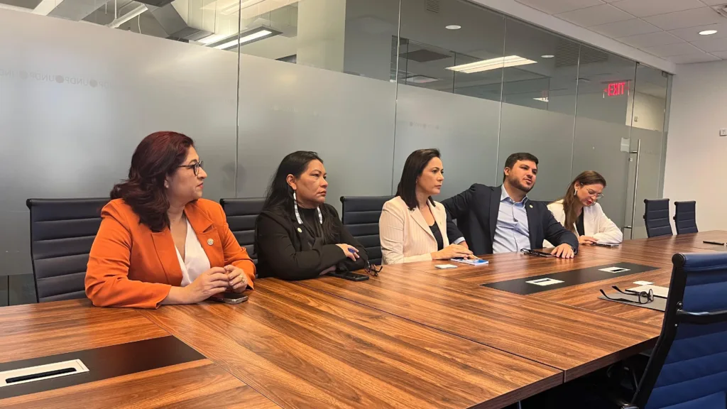 A vice-governadora Mailza Assis, liderou nesta quinta-feira, 25, em Nova York, a comitiva acreana em uma reunião estratégica com representantes do Programa das Nações Unidas para o Desenvolvimento (Pnud), ao lado do secretário de Meio Ambiente, Leonardo Carvalho; da secretária adjunta Renata Souza; da secretária dos Povos Indígenas, Francisca Arara; e da presidente do Instituto de Mudanças Climáticas (IMC), Jaksilande Araújo.