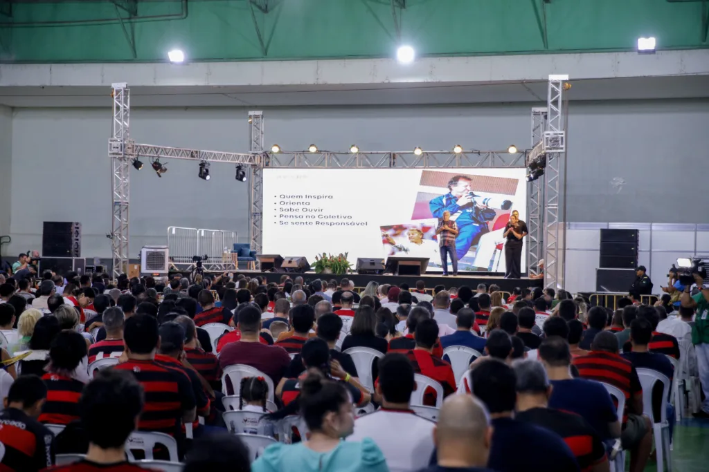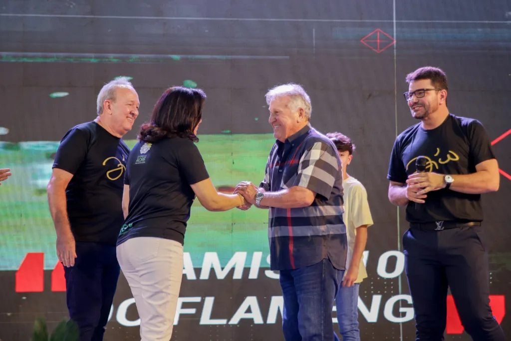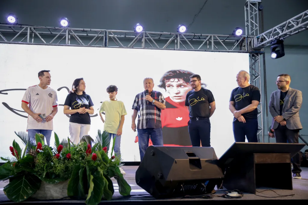 Flamenguista, o governador Gladson Camelí subiu ao palco acompanhado do filho Guilherme e reforçou o simbolismo da presença do ídolo no Acre e sua capacidade de inspirar novas gerações.