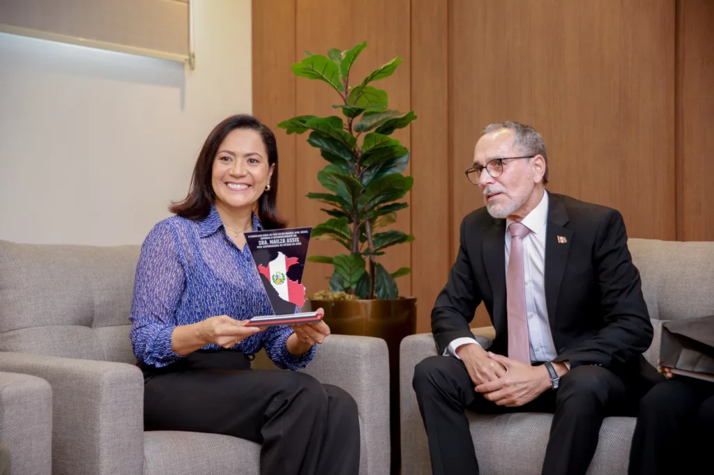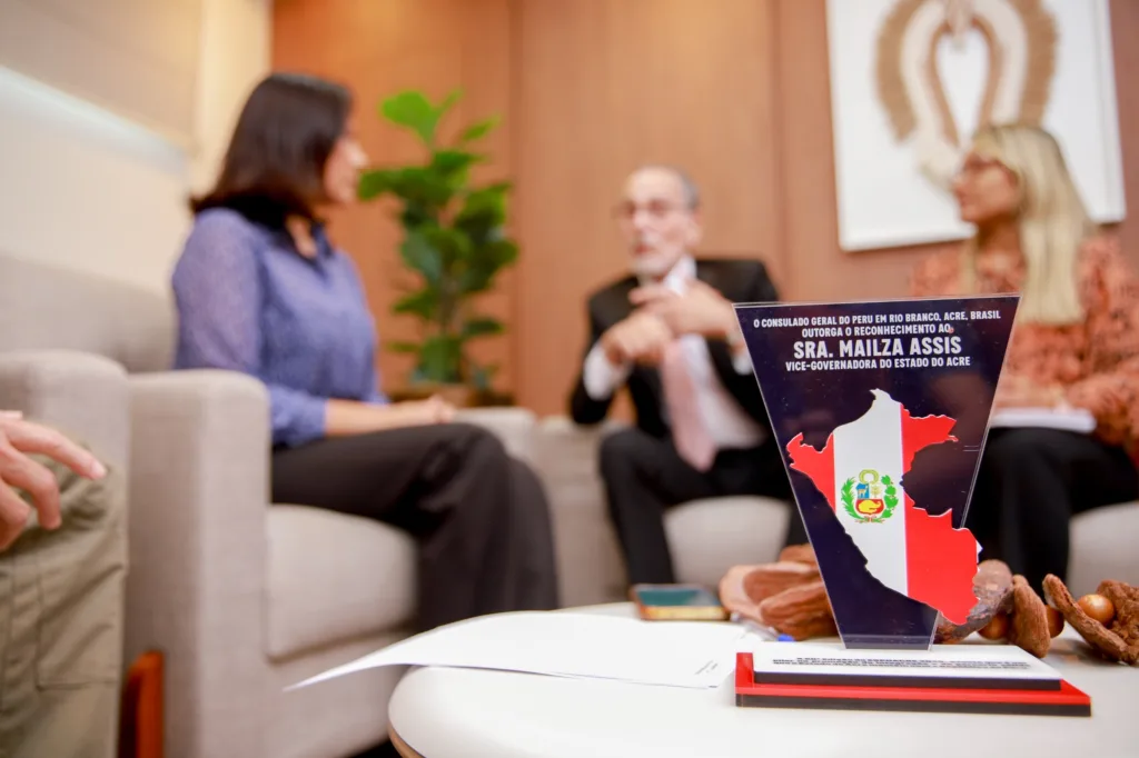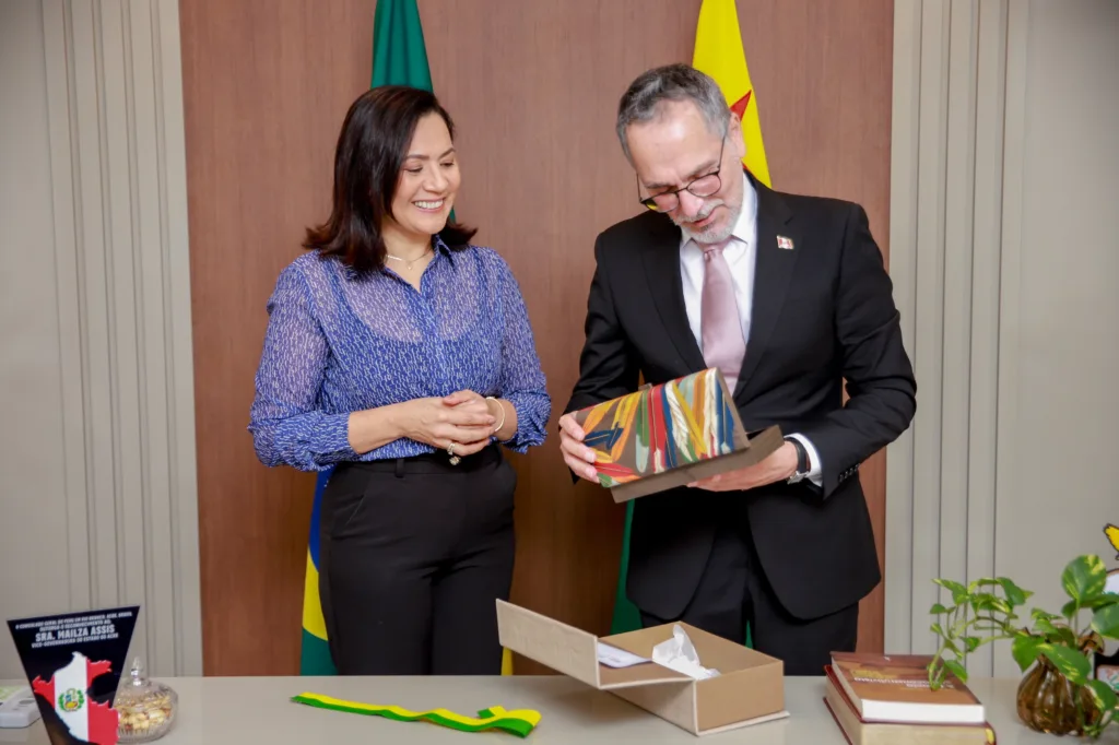 A vice-governadora Mailza Assis recebeu nesta quarta-feira, 10, a visita do cônsul-geral do Peru em Rio Branco, Pedro Alberto Rubín. Durante o encontro, Rubín entregou uma placa de reconhecimento à vice-governadora pela contribuição do Acre à integração Brasil-Peru, especialmente no marco da 50ª edição da Expoacre 2025.