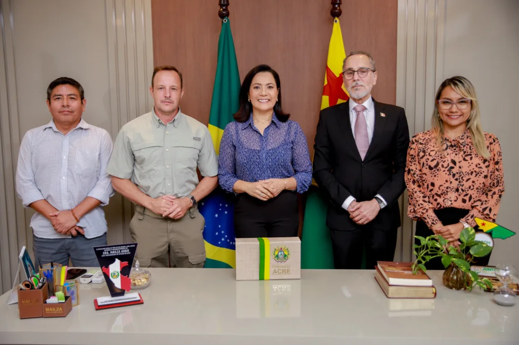 A vice-governadora Mailza Assis recebeu nesta quarta-feira, 10, a visita do cônsul-geral do Peru em Rio Branco, Pedro Alberto Rubín. Durante o encontro, Rubín entregou uma placa de reconhecimento à vice-governadora pela contribuição do Acre à integração Brasil-Peru, especialmente no marco da 50ª edição da Expoacre 2025.